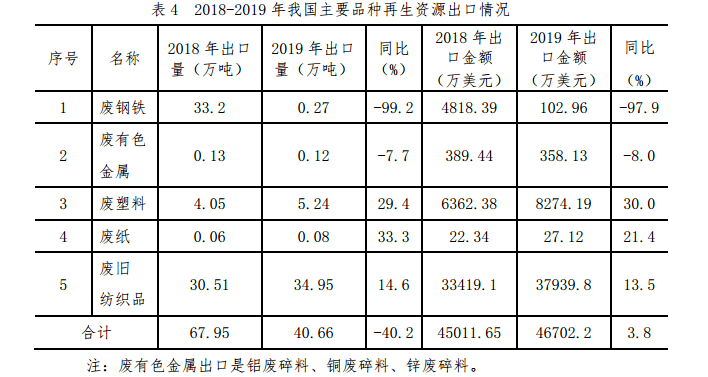 2019 年,我國(guó)廢鋼鐵、廢有色金屬、廢塑料、廢紙、廢舊紡織品五大品種再生資源出口量 40.66 萬(wàn)噸,同比下降 40.2%。2018-2019年我國(guó)主要品種再生資源出口情況如表4 所示。