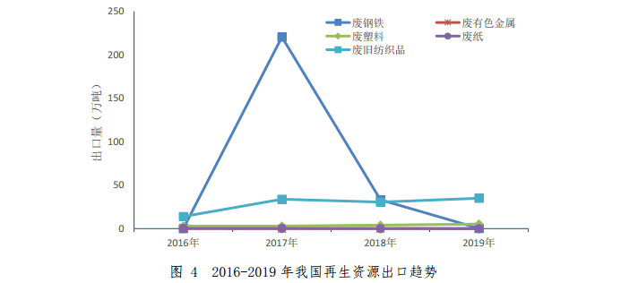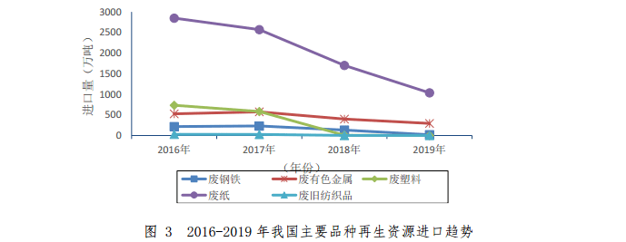 2019 年,我國(guó)廢鋼鐵、廢有色金屬、廢塑料、廢紙、廢舊紡織品五大品種再生資源進(jìn)口量為 1349.42 萬(wàn)噸,同比下降 39.8%。其中降幅最大的是廢塑料,同比下降98.2%。2018-2019年我國(guó)主要品種再生資源進(jìn)口情況如表3所示。2016-2019 年我國(guó)再生資源進(jìn)口趨勢(shì)如圖 3 所示。