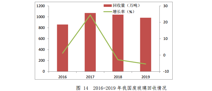 2019 年,我國(guó)廢玻璃回收量約 984 萬(wàn)噸,同比下降5.4%。其中,廢平板玻璃回收量約591.6萬(wàn)噸,占總回收量的60.1%,同比增長(zhǎng)5.6%;廢日用玻璃回收量約 299 萬(wàn)噸,占總回收量的 30.4%,同比下降 0.3%;其他類(lèi)廢玻璃回收量約 93.3 萬(wàn)噸,占總回收量的 9.5%,同比下降 48.2%。2016-2019 年我國(guó)廢玻璃回收情況如圖 14 所示。