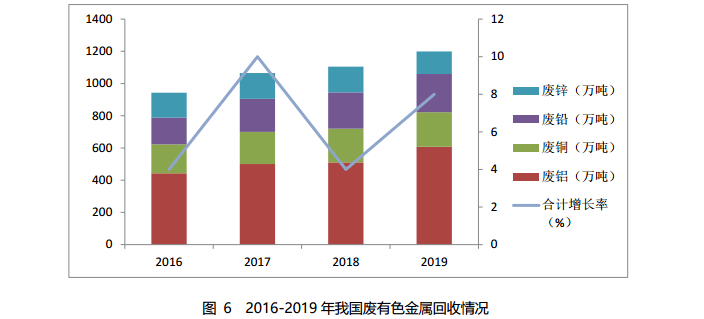 2019 年,國(guó)內(nèi)廢銅、廢鋁、廢鉛和廢鋅的回收量約1199萬(wàn)噸,其中廢銅回收量約 215 萬(wàn)噸,廢鋁回收量約607萬(wàn)噸, 廢鉛回收量約237萬(wàn)噸,廢鋅回收量約140萬(wàn)噸。2016-2019年我國(guó)廢有色金屬回收情況如圖6所示。