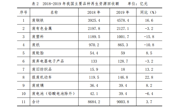 2019年,我國(guó)十大品種再生資源回收總額約9003.8億元,同比增長(zhǎng)3.7%。報(bào)廢機(jī)動(dòng)車(chē)、廢鋼鐵、廢舊紡織品、廢輪胎、廢玻璃等品種的回收額均有增長(zhǎng),其中報(bào)廢機(jī)動(dòng)車(chē)回收額增幅最高,同比增長(zhǎng)22.8%。2018-2019年我國(guó)主要品種再生資源回收額如表2所示。