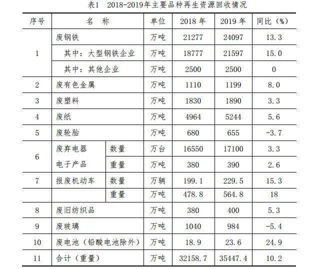 2019年,我國(guó)再生資源回收企業(yè)約10萬(wàn)家,回收行業(yè)從業(yè)人員約1500萬(wàn)人。截至2019年底,廢鋼鐵、廢有色金屬、廢塑料、廢輪胎、廢紙、廢棄電器電子產(chǎn)品、報(bào)廢機(jī)動(dòng)車(chē)、廢舊紡織品、廢玻璃、廢電池十大品種的回收總量約3.54億噸,同比增長(zhǎng)10.2%。2018-2019年主要品種再生資源回收情況如表1所示。