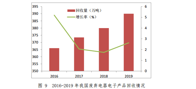 截至 2019 年底,全國(guó)共有 29 個(gè)?。▍^(qū)、市)的 109 家廢棄電器電子產(chǎn)品拆解處理企業(yè)納入廢棄電器電子產(chǎn)品處理基金補(bǔ)貼企業(yè)名單,電視機(jī)、微型計(jì)算機(jī)、洗衣機(jī)、電冰箱和空氣調(diào)節(jié)器的回收量約 17100 萬(wàn)臺(tái),報(bào)廢重量超過(guò)390萬(wàn)噸。2016-2019 年我國(guó)廢棄電器電子產(chǎn)品回收情況如圖9所示。