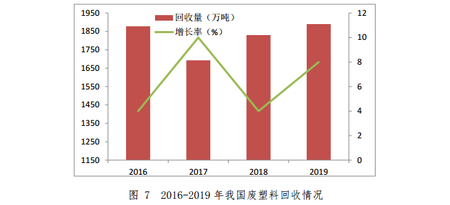 2019年國(guó)內(nèi)廢塑料回收量約1890萬(wàn)噸,較2018年增加了60萬(wàn)噸,增幅為3.3%。2019年廢塑料進(jìn)口量幾乎為零。2016-2019年我國(guó)廢塑料回收情況如圖7所示。