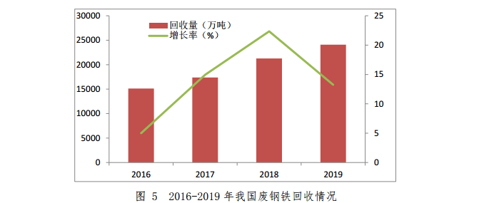 2019年,我國(guó)粗鋼和鋼材產(chǎn)量分別為9.96億噸和12.05億噸,同比增長(zhǎng)8.3%和9.8%,粗鋼產(chǎn)量再創(chuàng)歷史新高;回收廢鋼鐵約24097萬(wàn)噸1,同比增長(zhǎng)13.3%。其中,重點(diǎn)大型鋼鐵企業(yè)回收廢鋼鐵約21597萬(wàn)噸,同比增長(zhǎng)15.0%;其他企業(yè)回收廢鋼鐵約2500萬(wàn)噸,與2018年持平;廢鋼單耗為216.7kg/t 鋼,同比增加14.4kg/t鋼,增幅為7.1%,綜合廢鋼比21.67%, 同比增加1.49個(gè)百分點(diǎn)。2016-2019年我國(guó)廢鋼鐵回收情況如圖5所示。