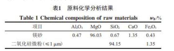 中頻爐爐襯作為感應(yīng)爐的重要組成部分,不但直接影響熔煉質(zhì)量,而且還影響生產(chǎn)成本。堿性爐襯具有抗堿性熔渣侵蝕的優(yōu)異性能,不污染鋼液,原料來(lái)源豐富,生產(chǎn)工藝簡(jiǎn)單,使用方便等優(yōu)點(diǎn)。目前,以硼酸為燒結(jié)劑的堿性爐襯應(yīng)用廣泛,但由于硼酸的強(qiáng)烈助熔作用,導(dǎo)致?tīng)t襯的使用壽命短、熔煉成本高。本試驗(yàn)以二氧化硅微粉為燒結(jié)劑,利用其顆粒小、活性大、填???? 粉。該二氧化硅微粉是冶煉金屬硅或硅鐵時(shí),產(chǎn)生的揮發(fā)性SiO或Si氣體遇空氣迅速氧化而成的非結(jié)晶相無(wú)定形圓球狀顆粒,表面較為光滑,粒度小于1 μm的占87%以上,平均粒徑在0.2~0.3 μm,比表面積為19.2 m2/g,活性高?;瘜W(xué)成分分析見(jiàn)表1。表1 原料化學(xué)分析結(jié)果