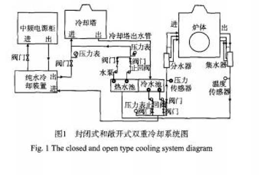 中頻爐的冷卻方式多種多樣,并且隨著中頻爐的發(fā)展而發(fā)展。發(fā)展初期,中小功率的中頻爐一般采用水池+水泵的開放式冷卻系統(tǒng)。由于中頻電源內(nèi)的元器件和補(bǔ)償電容器的冷卻水管道比較細(xì),為了防止結(jié)垢堵塞管道,出現(xiàn)了使用軟化水或純凈水的閉路循環(huán)冷卻方式,現(xiàn)在中頻電源和補(bǔ)償電容器多采用封閉冷卻塔方式冷卻l3l。中頻爐爐體的感應(yīng)線圈工作時(shí)會產(chǎn)生大量的熱量,但因感應(yīng)圈內(nèi)徑較粗不易發(fā)生堵塞,爐體冷卻水溫度可以略高,這樣反而能夠提高電爐的熱效率,同時(shí)減小冷卻裝置的體積,可以采用帶冷卻塔敞開式循環(huán)冷卻系統(tǒng),也可以采用封閉式冷卻塔。由于封閉式和敞開式雙重冷卻系統(tǒng)運(yùn)行可靠、所需費(fèi)用較低因此應(yīng)用的也較多。