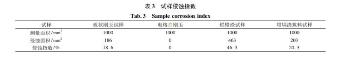對上述四種中頻爐內(nèi)襯試樣侵蝕部位進行觀察如圖 5 所示。試樣寬度均為 25 mm,板狀剛玉試樣被侵蝕約 5 mm, 電熔白剛玉試樣未觀察到宏觀侵蝕,鋁鉻渣試樣被侵蝕約 12 mm,坩堝澆注料試樣被侵蝕約 5 mm,按公式 ( 1) 計算試樣侵蝕指數(shù)如表 3 所示。 侵蝕指數(shù) R = 侵蝕面積 測量面積 × 100%