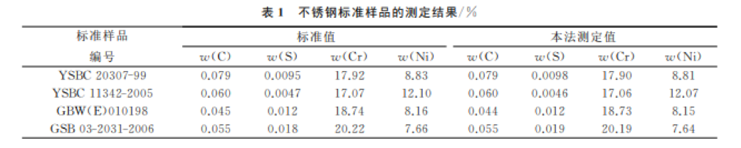 選?。磦€不銹鋼標準樣品,按本方法分析步驟進行測定,結(jié)果如表1所示。