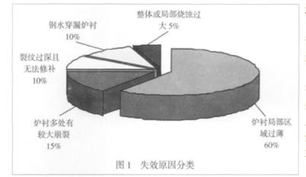 柳工機械股份有限公司鑄鋼廠每年熔煉鑄鋼鋼 液約 16000t,使用 6t 中頻爐和 3t 電弧爐熔煉碳鋼。長期以來中頻爐使用一家知名的爐襯材 料供應(yīng)商提供的爐襯材料,但一直存在著中頻電爐爐襯壽命 偏短的問題,平均爐襯壽命約 45 爐。爐襯壽命偏短 導(dǎo)致頻繁的修筑爐襯和烘爐,對生產(chǎn)組織和成本控 制都帶來了很不利的影響。為了解決這個問題,從 2008 年 6 月開始,我們開始在延長爐襯壽命方面進 行探索。我們首先進行了中頻爐煉鋼爐襯的失效原 因分析。 根據(jù)對 2008 年全年筑爐 25 次的失效統(tǒng)計,目 前的中頻電爐爐襯材料最主要缺點是裂紋傾向大,爐襯容易 因裂紋而導(dǎo)致多處崩裂、造成局部區(qū)域過薄而失效; 其次是中頻電爐爐襯下部燒蝕過快導(dǎo)致爐襯失效。失效原因 分類見圖 1。
