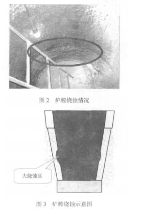 2009 年 2 月,我們與一家知名的爐襯材料供應(yīng) 商共同按照我們提出的性能要求選擇了一種爐襯材 料并進行首次工藝試驗。首次試驗爐襯壽命為 40 爐次,未達到 預(yù)期要求。分析原因為爐膛中下部局部燒蝕 過大造成失效,如圖 2、圖 3 所示。 從試驗后拆爐過程看,爐襯整體未發(fā)現(xiàn) 有大的裂紋和崩裂。這說明這種爐襯材料產(chǎn) 生裂紋的傾向性很小,安全性較好。爐襯的 上部和爐底損壞較??;但是在爐身中下部, 爐身 1/3 高度上有明顯的較大燒蝕區(qū).