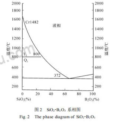 中頻電爐烘爐與燒結要達到2個目的:①排除爐襯材料中的水分;②完成石英砂的晶型轉(zhuǎn)變且不開裂,最終獲得由α2方石英形成的燒結層、半燒結層和未燒結層3層結構的爐襯,在不同的溫度完成不同的任務,在不同的溫度區(qū)間控制不同的升溫速度。燒結過程是在高溫下使石英砂料的接觸面上出現(xiàn)液相結合,形成連續(xù)的燒結網(wǎng)絡。通過網(wǎng)絡使整個石英料聯(lián)成一個整體[2]。燒結后的爐襯斷面分為燒結層、半燒結層、未燒結層。燒結層要求密度大、強度高、表面裂紋少,砂粒顆粒之間全部熔化,燒結網(wǎng)絡均勻完整。燒結層的厚度約占全壁厚的37%~48%。半燒結層是燒結層和未燒結層之間的過渡區(qū),在該區(qū)內(nèi)部分顆粒的接觸面開始熔化,燒結網(wǎng)絡不完全。該層的作用是緩沖燒結層的應力,阻止燒結層內(nèi)產(chǎn)生的裂紋向外延伸。半燒結層的厚度約占全壁厚的28%~31%。未燒結層是半燒結層和感應圈之間有一層完全沒有燒結的原始砂料。這層砂料起著絕熱的作用,當爐襯在加熱和冷卻時,也起著體積膨脹和收縮的作用。未燒結層的厚度占全壁厚的27%~32%[3]。助燒結劑采用硼酸,它的主要作用是降低石英砂的燒結溫度。硼酸的化學式為H3BO3,當硼酸加熱脫水而成硼矸,它的分子式為B2O3。SiO22B2O3系相圖[4]見圖2,由圖可知,SiO2的熔點為1710℃,B2O3的熔點為450℃,B2O3與SiO2形成的共晶物只有372℃,就是說B2O3作為石英質(zhì)料的助燒結劑時,在372℃就會出現(xiàn)液相。